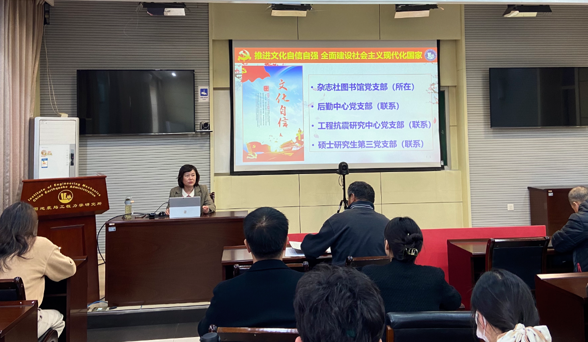 3月21日,黨委委員、副所長張令心同志以“推進(jìn)文化自信自強(qiáng),全面建設(shè)社會(huì)主義現(xiàn)代化國家”為題,為雜志社圖書館黨支部、后勤中心黨支部、工程抗震研究中心黨支部、碩士研究生第三黨支部宣講黨的二十大精神。