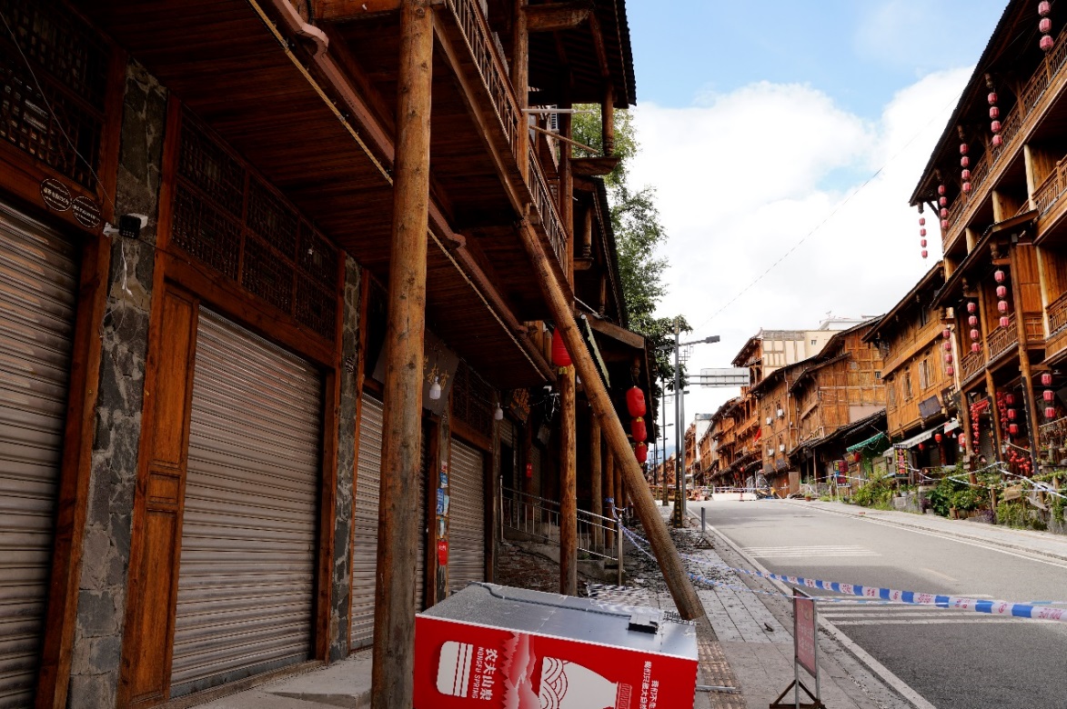 科考組還沿磨西鎮貢嘎大道、民宿風情街,逐棟考察了兩側房屋的震損情況,統計了全部考察房屋的結構類型、層數、破壞程度等信息,為震害分類統計及不同類型房屋的震損機理研究提供依據。沿街自建房屋大量存在結構形式混亂,結構受力形式不合理等問題。地形、場地對建筑破壞的影響明顯,靠近山頂、懸崖坡邊、填方地基上的建筑震害重。建議震后恢復重建要盡可能避開邊坡、填方地基等不利地段。