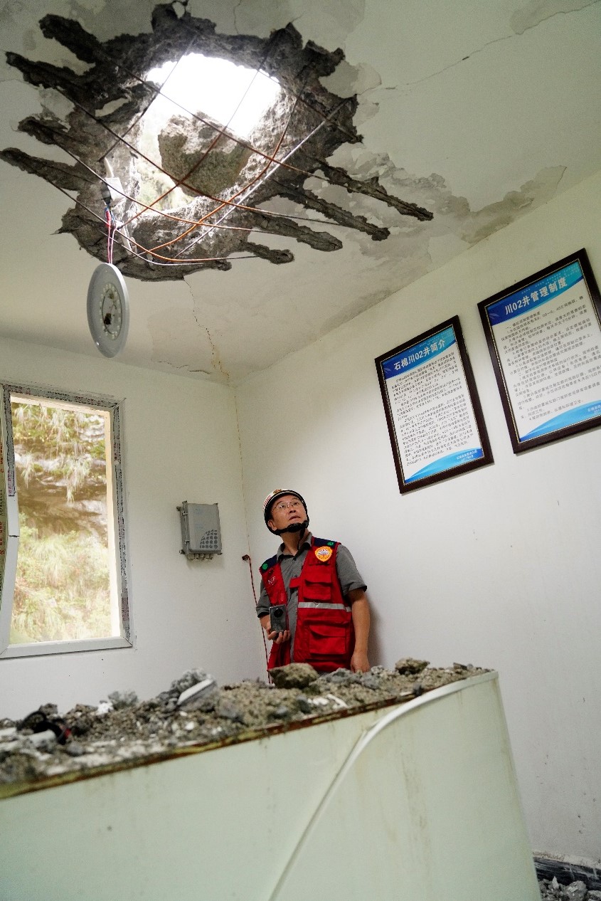 石棉線科考組圍繞石棉川02井、擦羅強震臺站、栗子坪強震臺站開展了周邊建筑震害調查。該區域儀器烈度與實際建筑破壞程度基本相符,考察區域的大部分震害為非結構構件的破壞,如框架結構填充墻開裂、瓷磚脫落等??瓶冀M考察到的2008年汶川地震后援建的中小學校舍在此次地震中表現良好,幾無震害。個別房屋出現了屋蓋和墻壁被落石直接擊穿的震害。