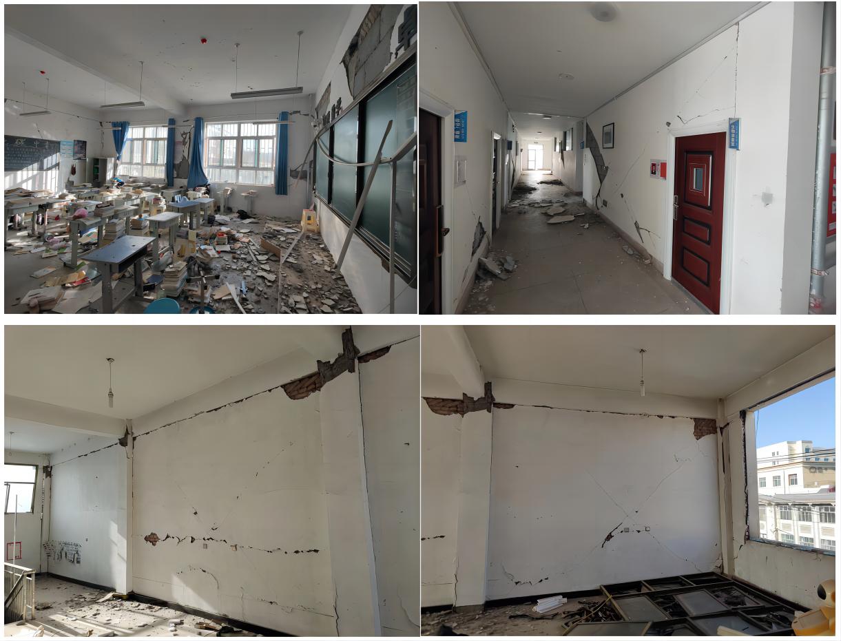 1.調(diào)查大河家中學(xué)教學(xué)樓、實驗樓、食堂和學(xué)生宿舍的震害情況。其中,4個結(jié)構(gòu)的結(jié)構(gòu)構(gòu)件均無明顯破壞,非結(jié)構(gòu)構(gòu)件砌體填充墻、吊頂破壞嚴(yán)重。雖無倒塌風(fēng)險,但使建筑的使用功能中斷。