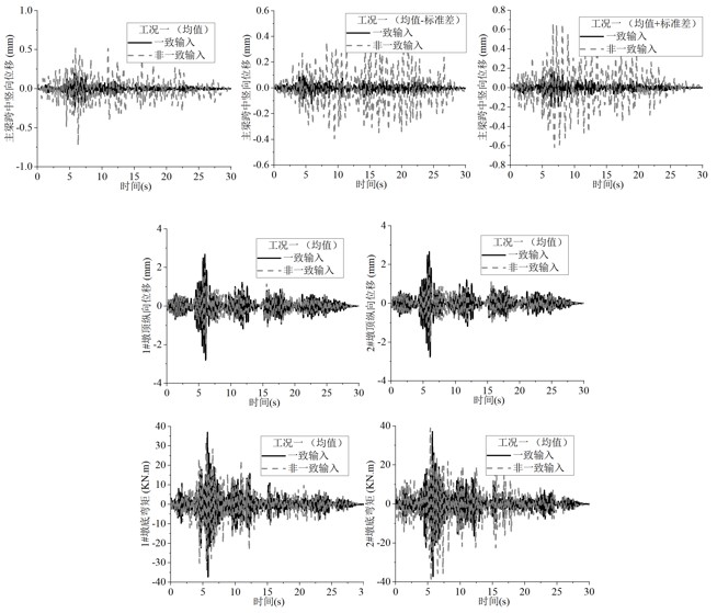 地震動的頻域非平穩(wěn)性可通過累積穿零量隨時間變化進(jìn)行描述,在傳統(tǒng)譜表達(dá)合成地震動的基礎(chǔ)上分別引入相位差譜和累積穿零量對合成結(jié)果進(jìn)行強(qiáng)度、頻域非平穩(wěn)化。利用CESMD數(shù)據(jù)庫中豐富的地震動記錄擬合出相位差譜隨震級、震中距變化模型,以及累積穿零量隨時間變化的經(jīng)驗(yàn)?zāi)P停俅肟臻g相干函數(shù)拓展為多點(diǎn)非平穩(wěn)地震動,改進(jìn)后方法流程如圖1。由圖2可知,所模擬的地震動時程不僅具有強(qiáng)度及頻域非平穩(wěn)性,同時體現(xiàn)了空間多點(diǎn)的相干性。將上述合成的地震動通過一大跨橋梁進(jìn)行多點(diǎn)地震動輸入驗(yàn)證,討論了一致和非一致輸入下的結(jié)構(gòu)響應(yīng)差異。