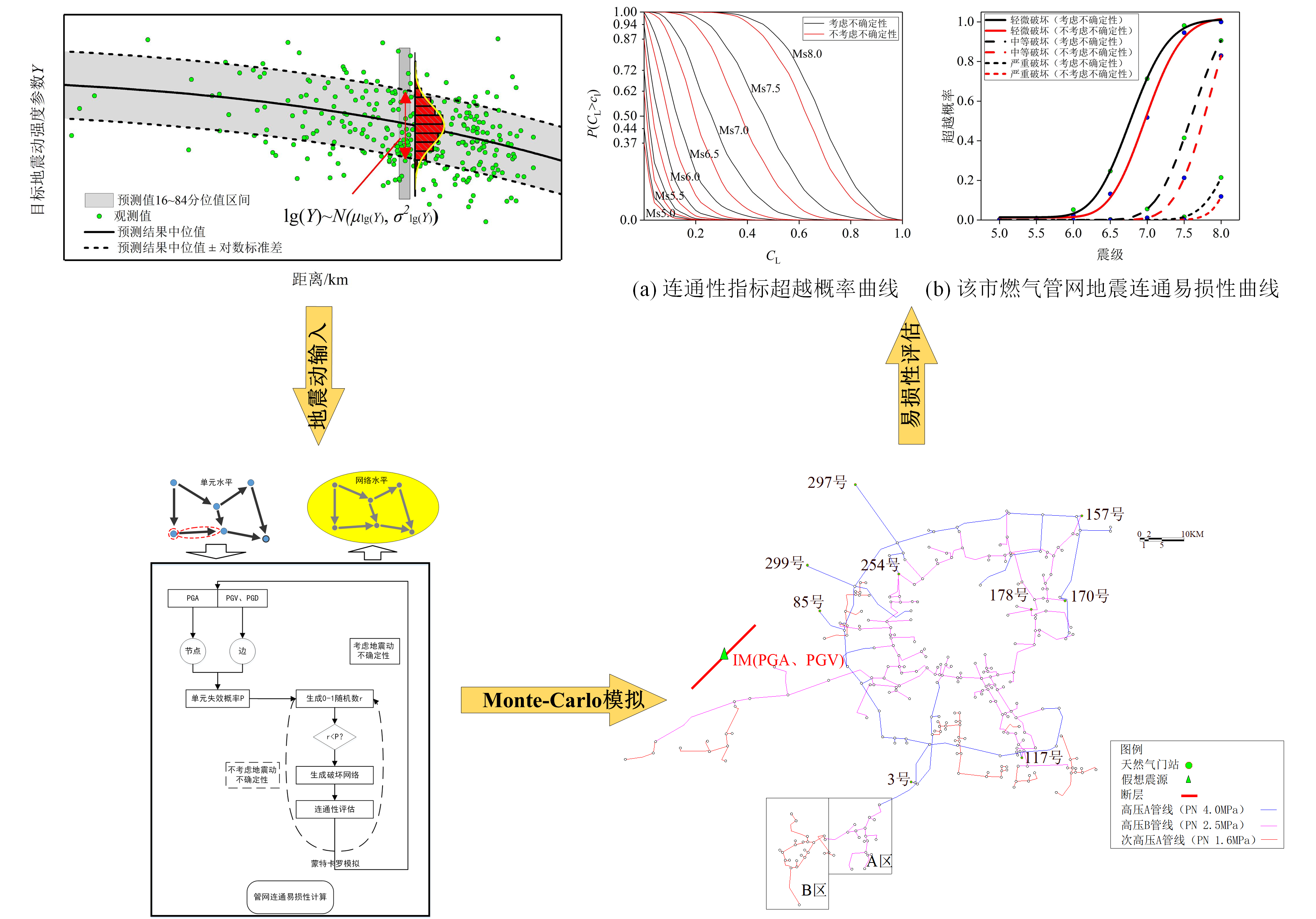 發布時間: 2022-07-29 點擊數量:7167(1)以地震動預測方程(GMPE)作為燃氣管網地震動輸入依據,同時采用正態分布抽樣模擬隨機誤差變量的分布以體現地震動的不確定性,從單元失效擴散至網絡失效,給出了基于Monte-Carlo模擬方法的城市燃氣管網地震連通易損性分析流程。并以我國華北某城市為例,應用該流程對該市燃氣管網的地震連通易損性進行了分析,驗證了該流程的適用性,同時對網絡地震動輸入時是否考慮地震動不確定性對連通易損性評估結果的影響進行了對比研究,結果表明:地震動不確定性在評估城市燃氣管網的抗震能力時有削弱作用,不可忽視其對結果的影響。銜接該流程可進一步完善燃氣管網抗震韌性定量評估方法。相關技術細節可查閱發表在《哈爾濱工業大學學報》上的論文。