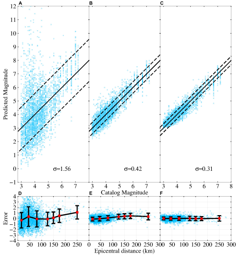 圖2 P波到達(dá)后3秒,(A,D)Tc方法、(B,E)Pd方法和(C,F)DCNN-M模型的震級估計